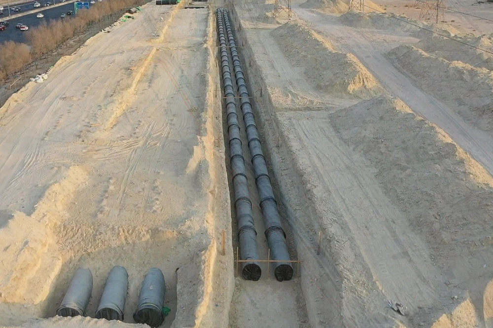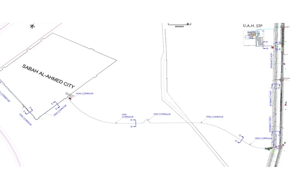 The wastewater transmission mains from SAA WWPS to the UAH WWTP Stage 1 include 2 x DN 1100 and the TSE transmission main to the existing Sabah Al Ahmed reservoir 1 x DN 1100 are constructed in a common corridor.