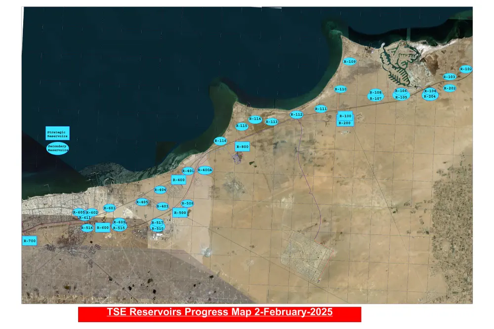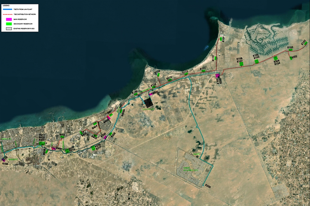 TSE transmission System and Distribution Network start with TSE pump station that feeds 5 transmission mains. One (1) transmission main DN 600 to zone 4 with a maximum hourly TSE flow of 1,700 m3/h, Two (2) transmission mains DN 1,400 to strategic reservoir R-500, R-600 and R-700 in zones 5, 6 and 7 with a maximum hourly TSE flow of 17,850 m3/h, One (1) transmission main DN 1,100 to Sabah Al Ahmed with a maximum hourly TSE flow of 4,100 m3/h, and one transmission main with a diameter decreasing from DN 1,000 to DN 600 throughout its course to zone 1, zone 2 and zone 8 with a maximum hourly TSE flow of 4,750 m3/h.