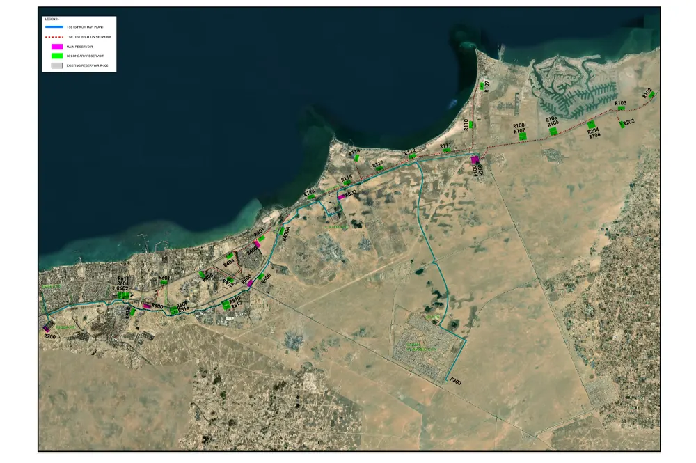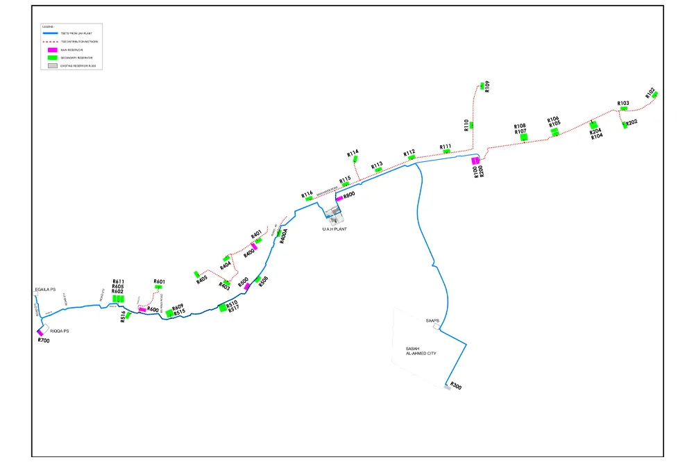 The transmission mains are connected to a network of 7 strategic and 32 secondary reservoirs the largest reservoir is R700 with volume equal 160,000 m3. The remaining is 6 identical strategic reservoirs located in zone 1, 2, 4, 5, 6 and 8 with volume equal 40,000 m3 each. The strategic reservoirs feed a total of and 32 Secondary Reservoirs 27 with a volume 2,000 m3 and 5 with volume 3,000 m3.